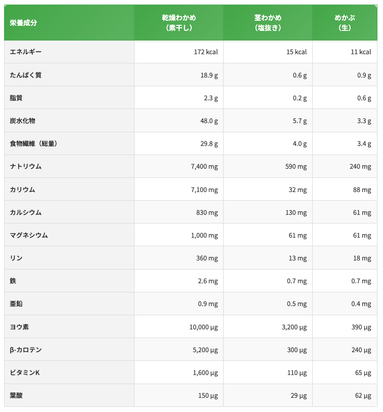 ・乾燥わかめは水分が約14%、茎わかめとめかぶは水分が約90%前後のため、直接比較する際は水分状態を考慮してください。