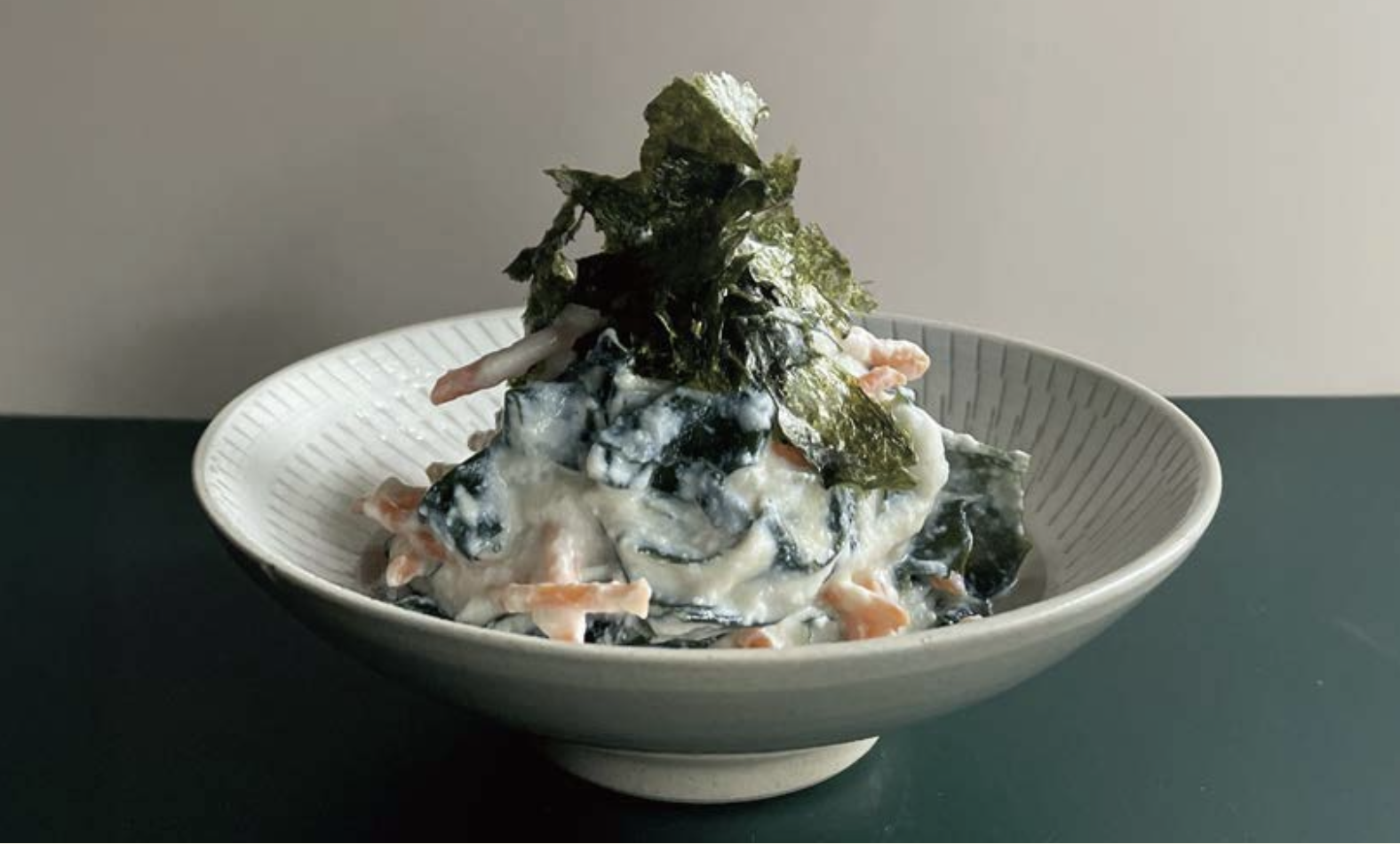 ①にドレッシングを加えて和え、器に盛りつけ、ちぎった海苔をのせる。