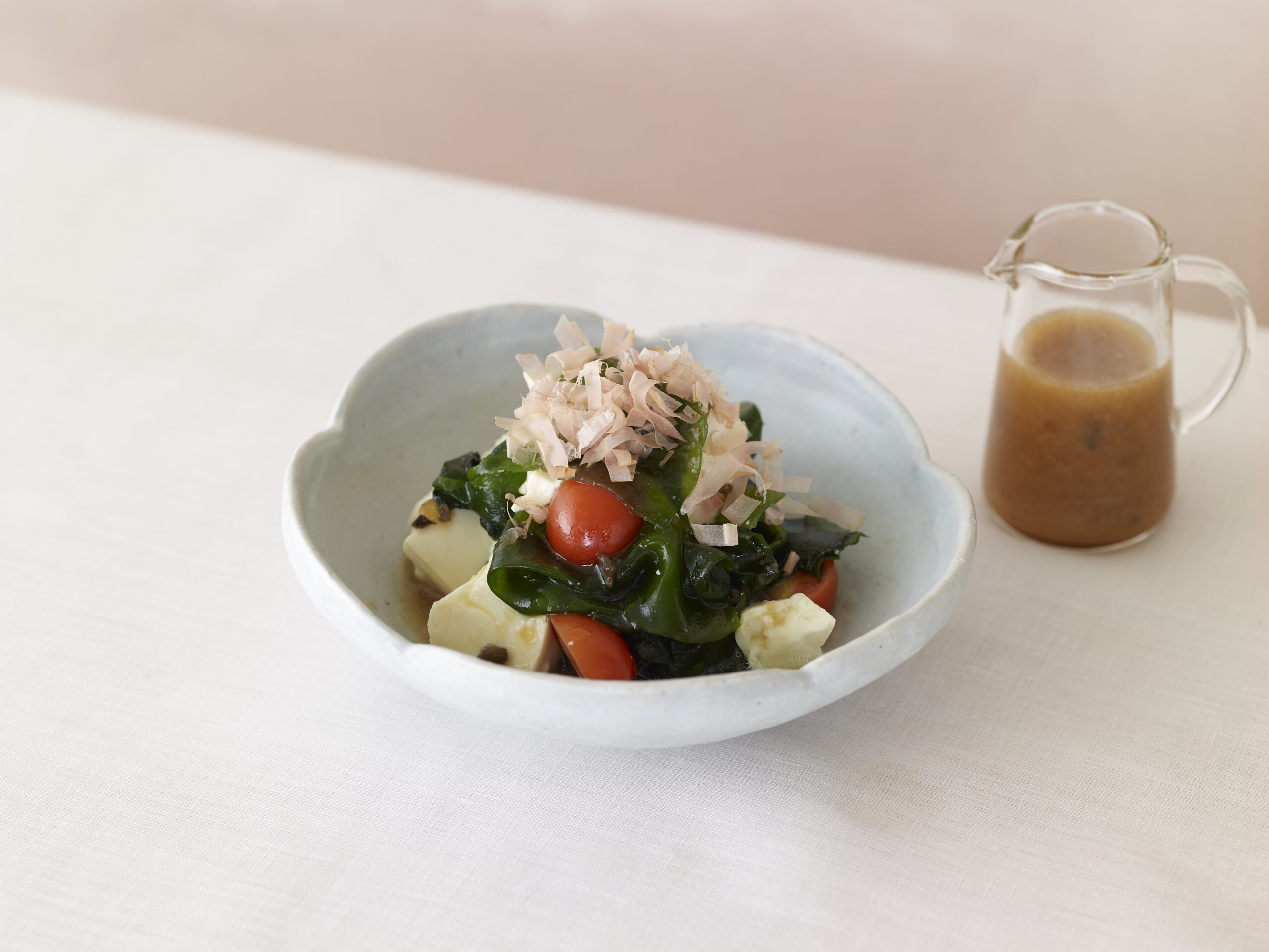 器に③を盛りつけ、仕上げ用のドレッシングを全体にかけ、お好みでかつお節をトッピングする。